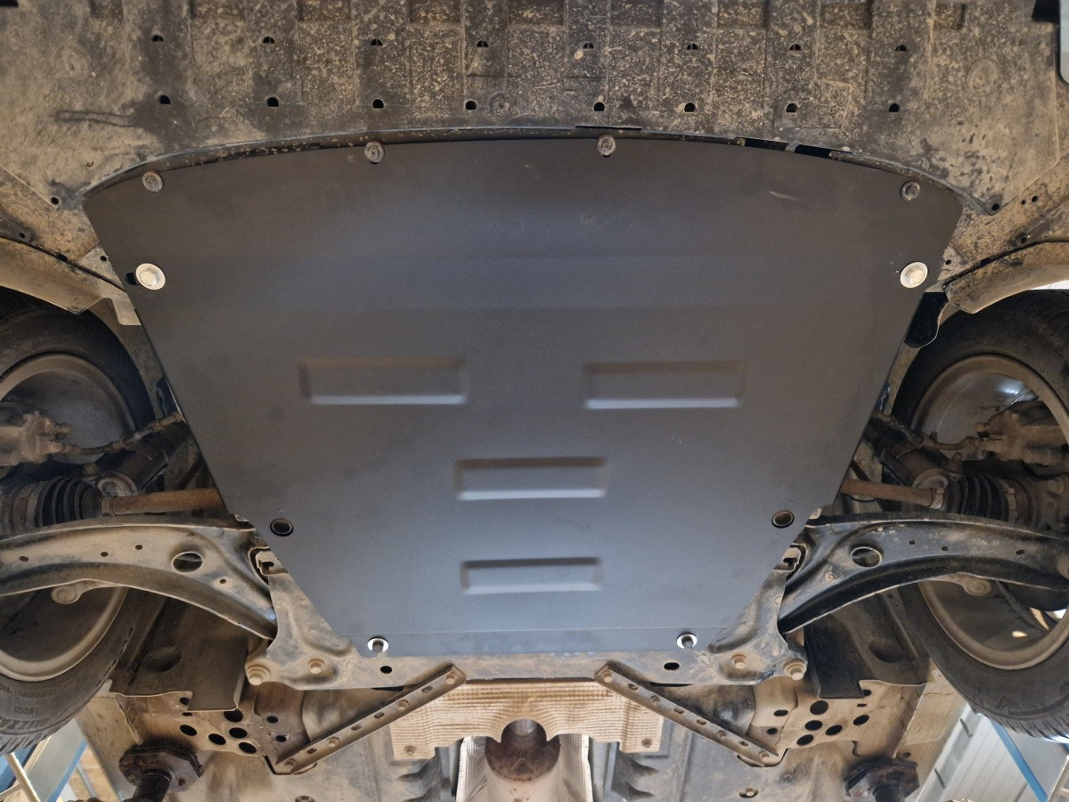 Der Stahl-Unterfahrschutz ist auf die originalen Befestigungspunkte abgestimmt und wird mit einem vollständigen Satz aus Blechplatten, Schrauben und Muttern befestigt.