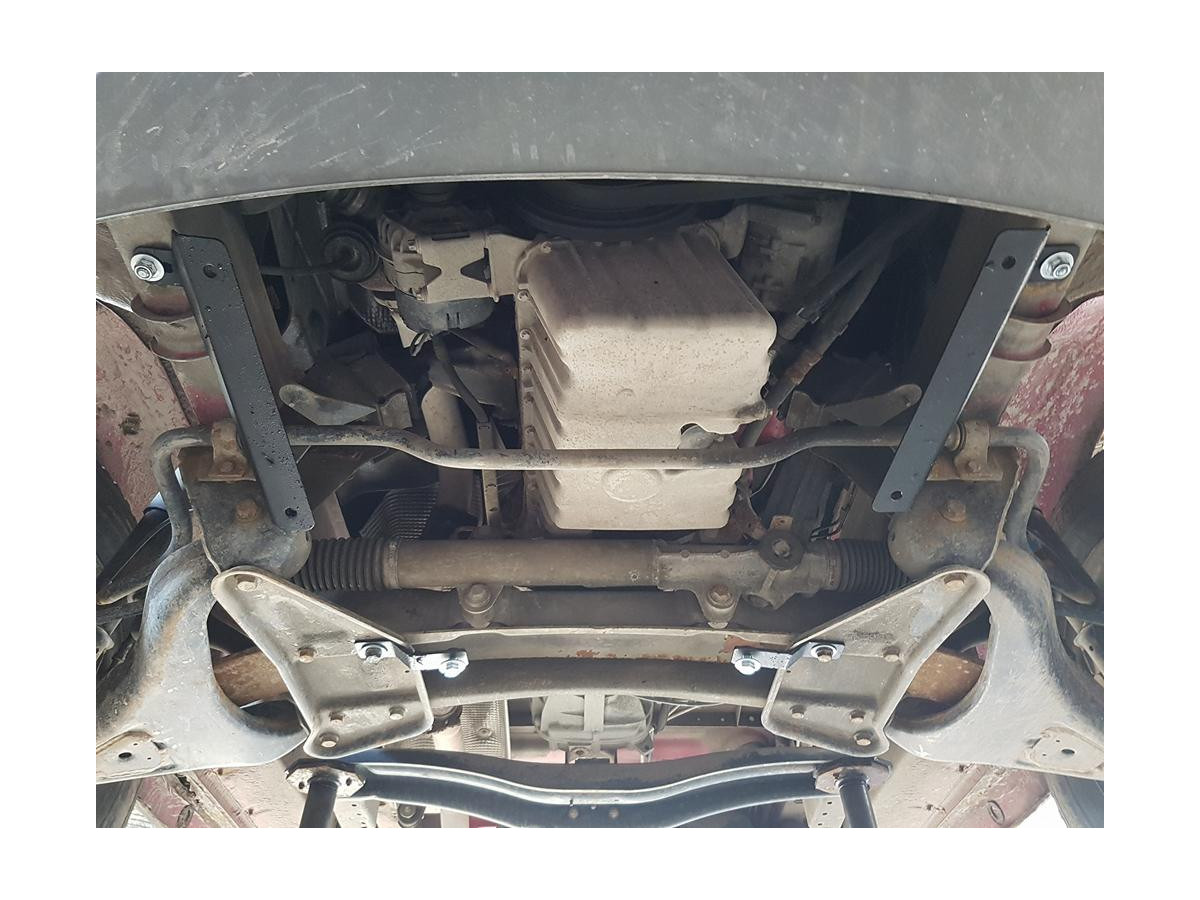 Der Stahl-Unterfahrschutz ist auf die originalen Befestigungspunkte abgestimmt und wird mit einem vollständigen Satz aus Blechplatten, Schrauben und Muttern befestigt.