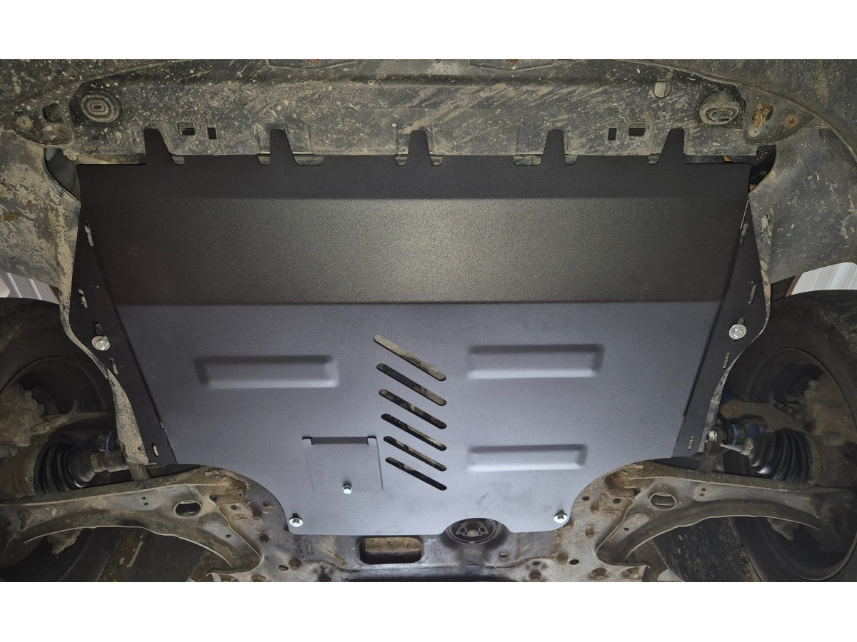 Der Stahl-Unterfahrschutz ist auf die originalen Befestigungspunkte abgestimmt und wird mit einem vollständigen Satz aus Blechplatten, Schrauben und Muttern befestigt.